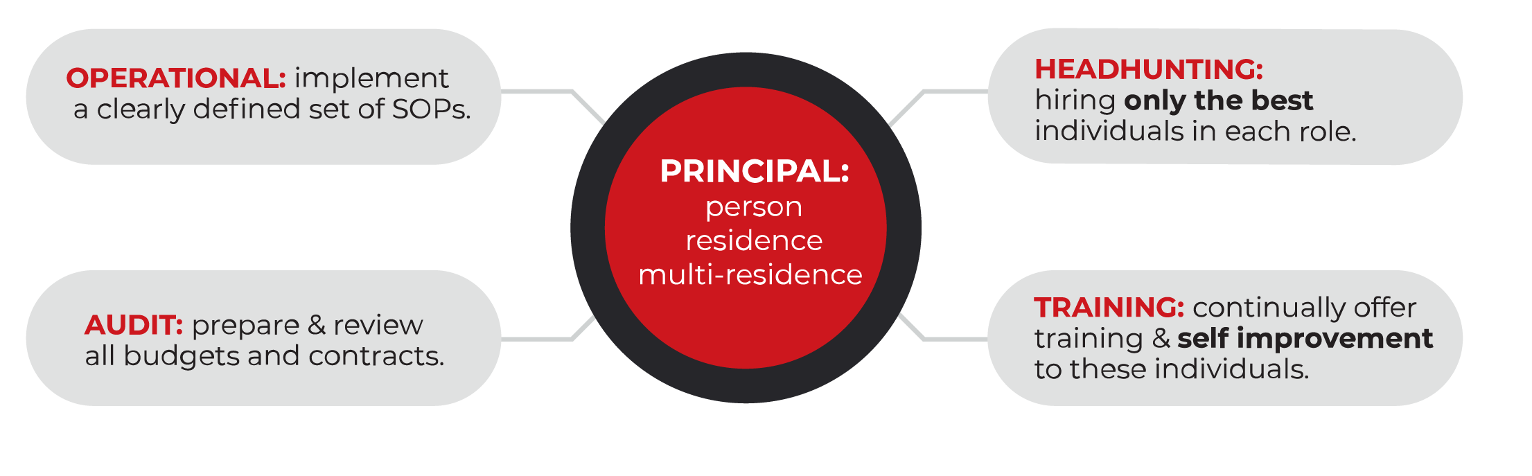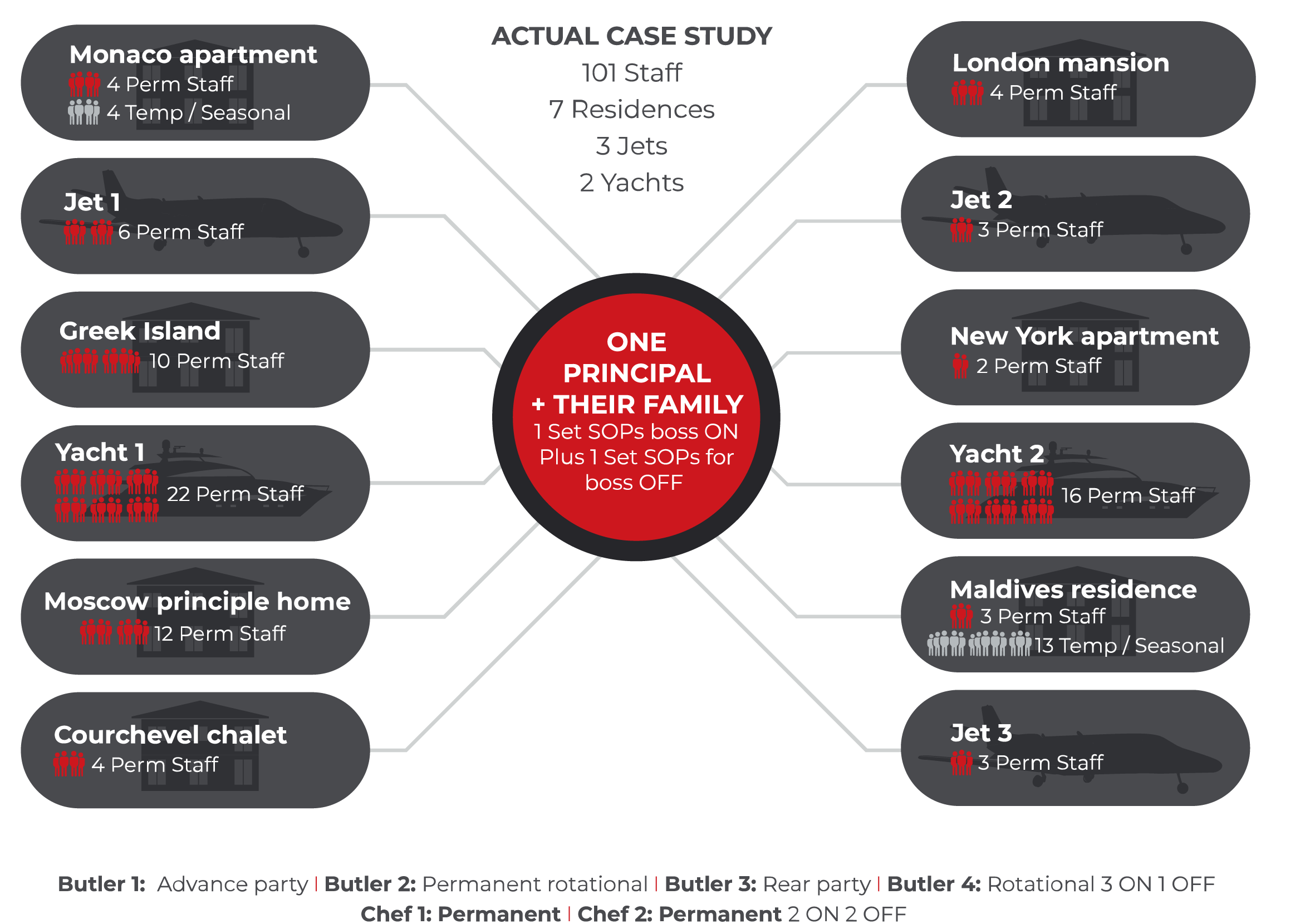 Our Approach Our Four-Pronged Approach to Private Staff Our Four-Pronged Approach to Private Staff Managing the staff within a single residence – in one static location – is far simpler than managing multi-nationalised staff within numerous locations, countries and types of residence (chalets, apartments, mansions, villas, islands, yachts and jets).